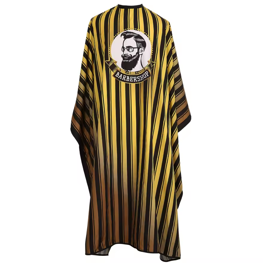 Tämä kulta-mustaraitainen, Barbershop-logolla varustettu cape on enemmän kuin vain suoja – se on sijoitus asiakaskokemukseen ja salongin brändiin. Tilaa nyt ja varmista, että jokainen hiustenleikkaus, värjäys tai hoito sujuu tyylikkäästi, mukavasti ja puhtaasti!