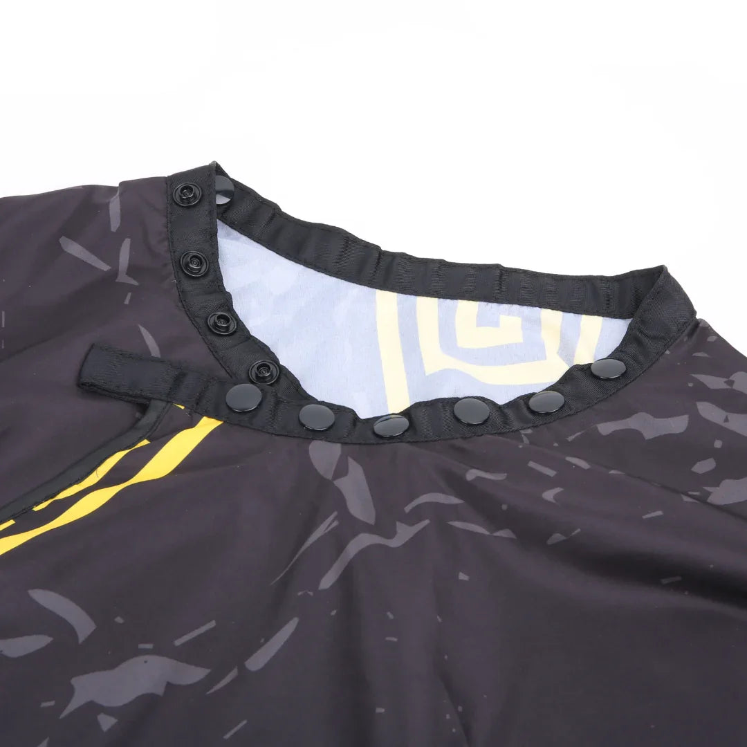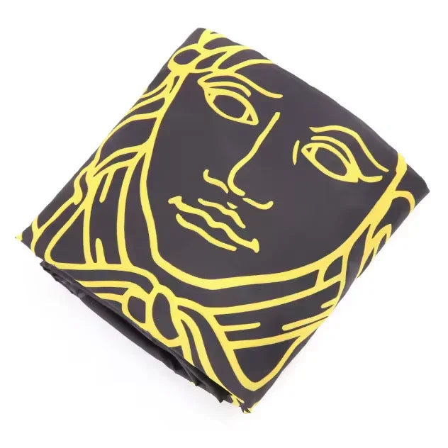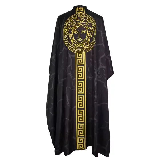 Kuvittele viitta, joka ei vain suojaa, vaan myös näyttää upealta. Tämä korkealaatuinen, tyylikkäällä Medusa-päähän ja kreikkalaisaiheisilla (Greek key/meander) kuvioilla koristeltu musta-kultainen viitta tuo ripauksen ylellisyyttä mihin tahansa ympäristöön. Se on täydellinen statement-kappale niin kotiparturille kuin ammattisalongillekin.