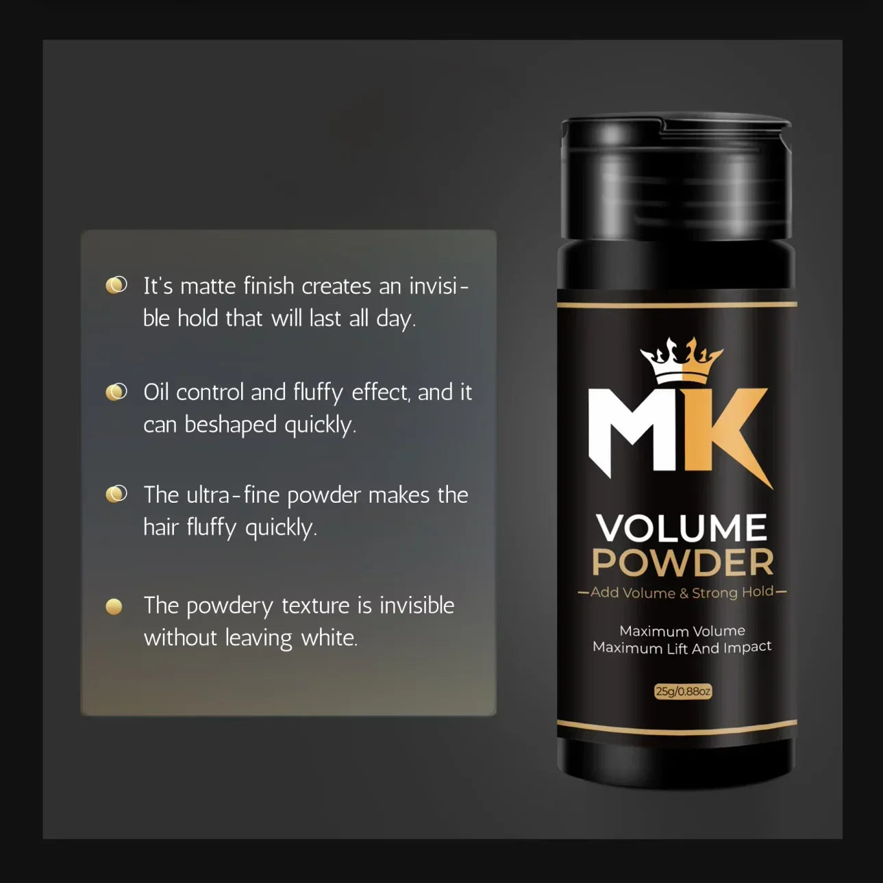 hair volume powder ammattilaisille, hiuspuuteri ja volyymipuuteri viimeistelyyn. MK Volume Powder sopii parturitarvikkeet-valikoimaan, hiusten tuuhennus -tarpeisiin sekä miesten hiustuotteet -hyllyyn. Saatavilla myös tukkumyynti kampaamoille ja hiuspuuteri jälleenmyyntiin.