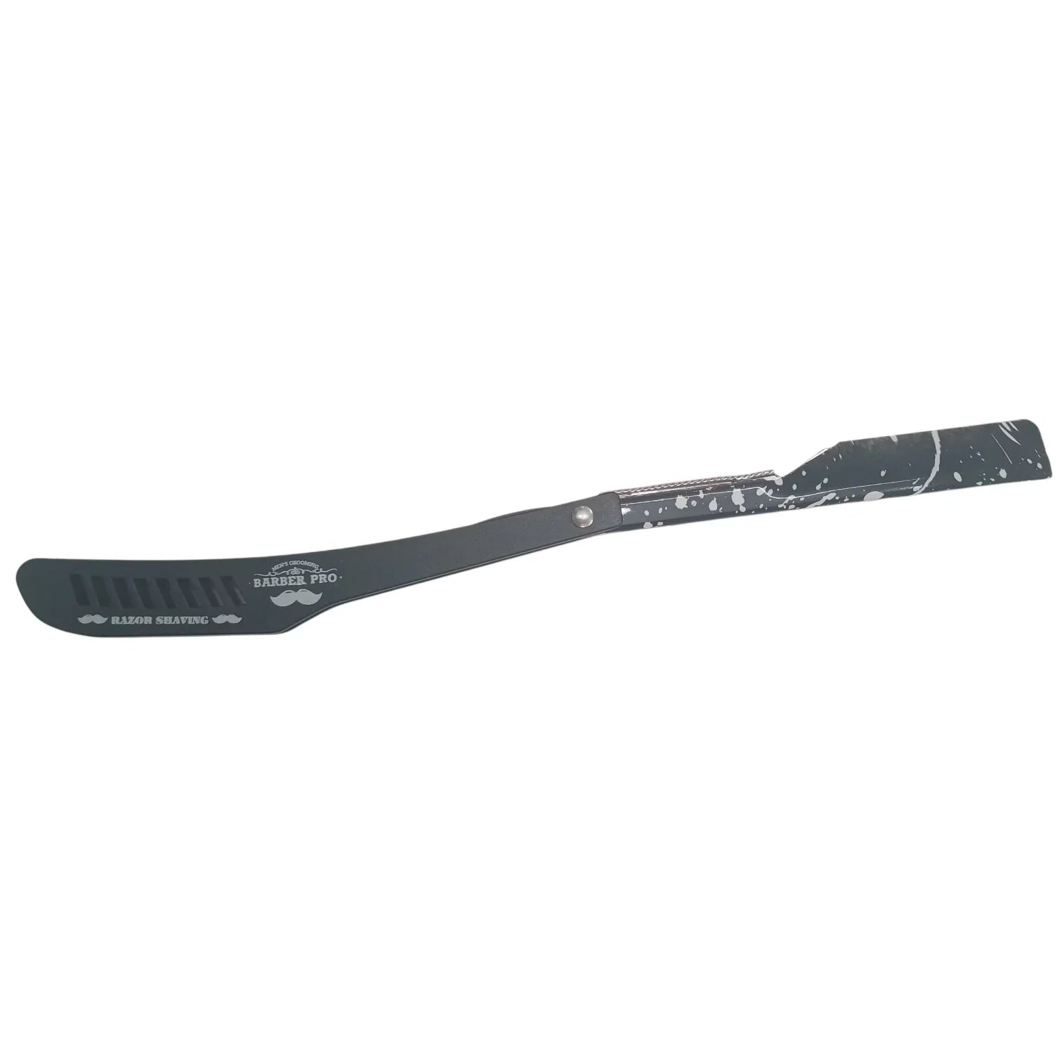 Kestävä Muotoilu: Kahvan säröilevä, graafinen muotoilu sekä etuosassa olevat leikkaukset tekevät veitsestä visuaalisesti upean ja tarjoavat samalla erinomaisen otteen. Siihen on kaiverrettu tunnuslause "MEN'S GROOMING • BARBER PRO • RAZOR SHAVING" – lupaus laadusta.